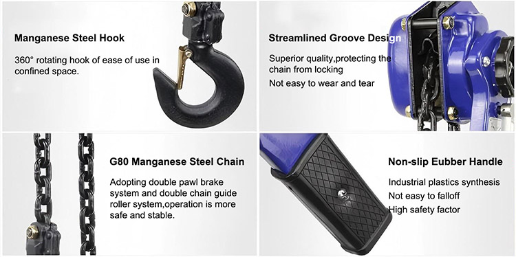 2. 標準揚程: 1.5 メートル、3 メートル、6 メートル、10 メートル、20 メートルなど (シングルチェーンの長さ)。チェーンの長さはカスタマイズ可能です。